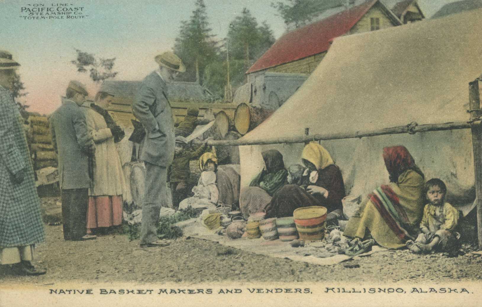 The postcard above was featured in the company’s “Alaska Excursions” booklet. A full-page ad asks, “Are you interested in basketry? Is Alaska represented?” Tourists visiting Alaska via THE TOTEM POLE ROUTE can purchase baskets, totems, and other curios at reasonable prices direct from the native makers.