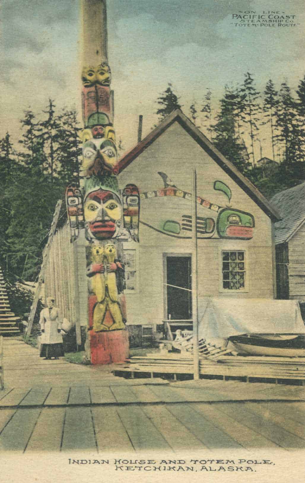 If you sent two cents in postage to the Pacific Coast Steamship Company you could have a booklet, The Alaskan Indian Mythology mailed to you about the totem pole that included the history, legends and traditions, along with a description of an Indian Potlatch, the most celebrated of Indian ceremonies.