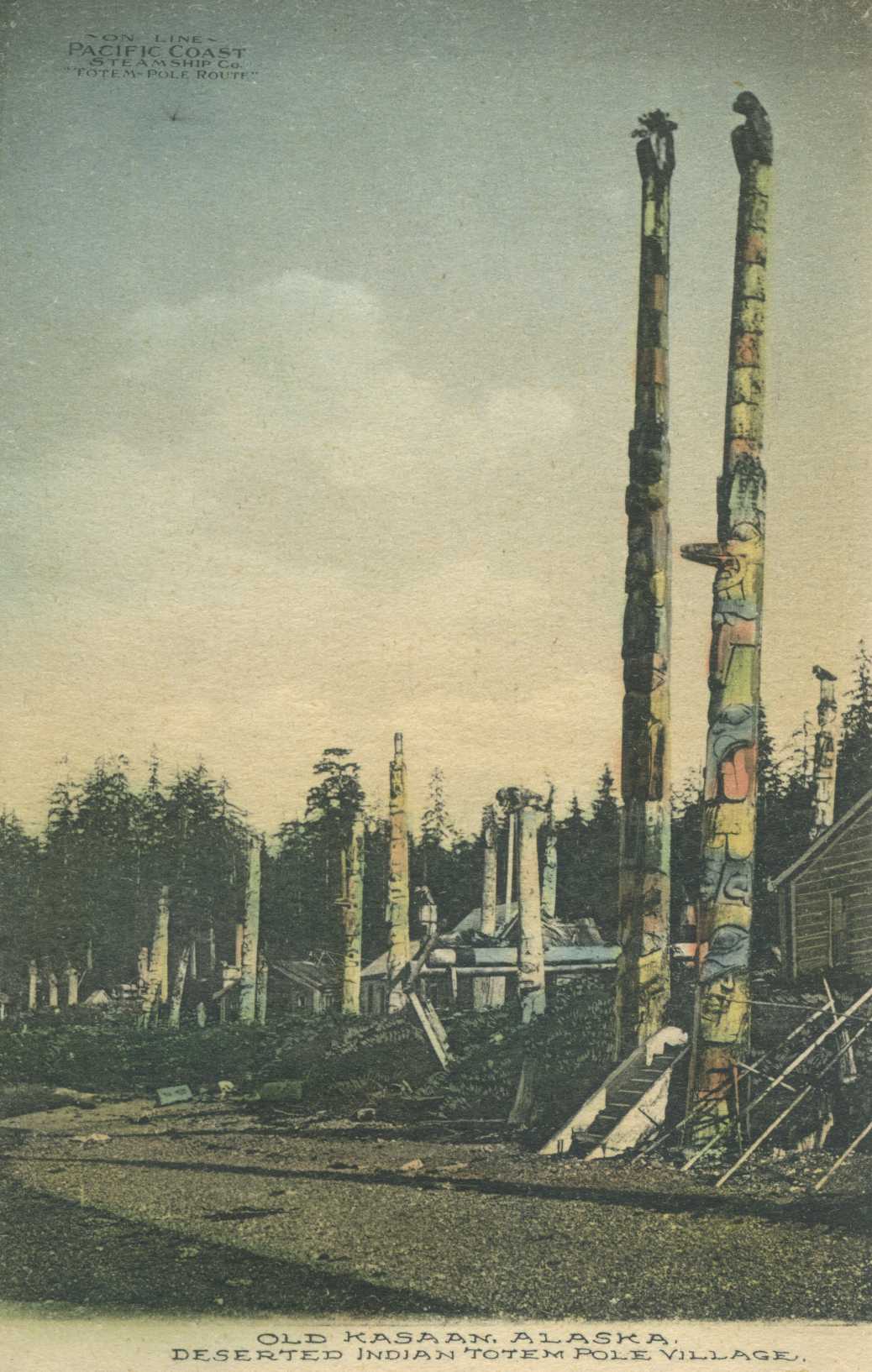 The two postcard images of totem poles, one in front of a house in Ketchikan and the other showing the totems in the deserted village of Kasaan can be found on many other postcards, but none are as attractive as these Albertype cards.